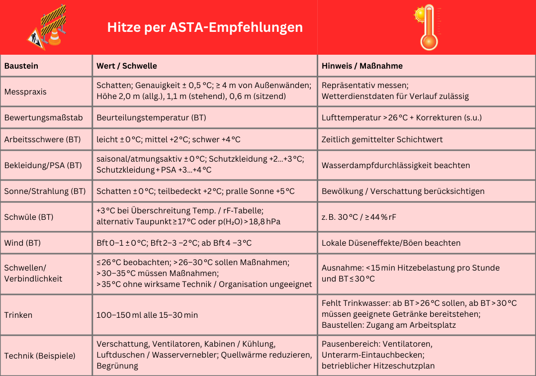Hitze: Entscheidende Größe ist die Beurteilungstemperatur (BT). Gemessen wird im Schatten, repräsentativ und mit ± 0,5 Grad Celsius Genauigkeit. Über 26 Grad addiert man Korrekturwerte für Arbeitsschwere (z. B. +2 °C bei mittel, +4 °C bei schwer), Bekleidung beziehungsweise PSA (bis +4 °C), Sonne (bis +5 °C), Schwüle (+3 °C bei überschrittener Kombination aus Temperatur/relative Feuchte(rF)) und zieht gegebenenfalls Wind ab (–2/–3 °C).